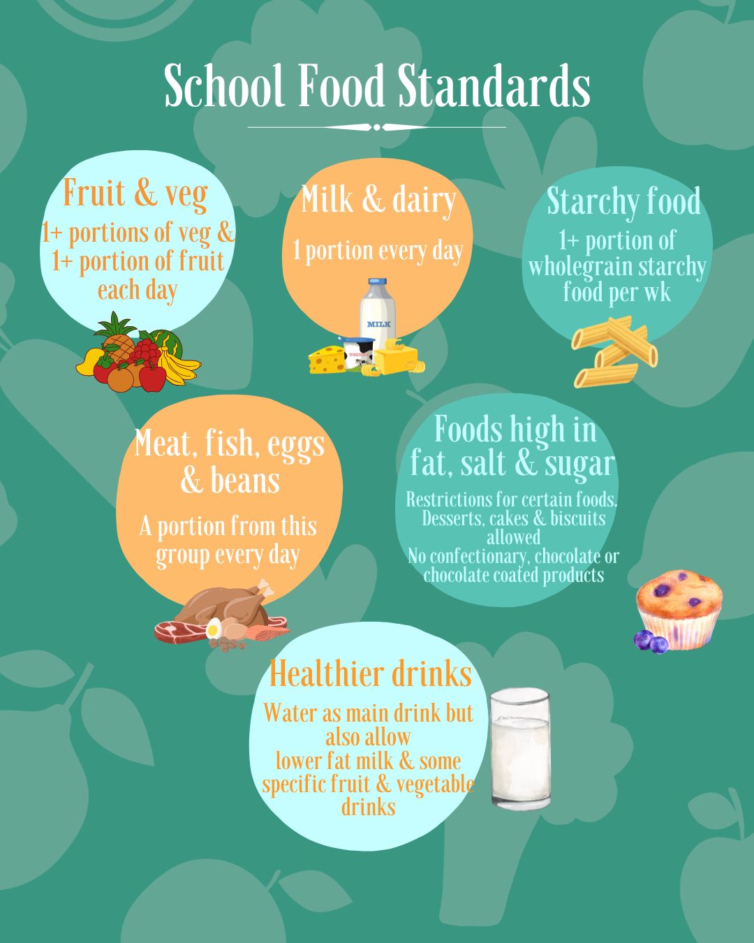 All school meals are designed to meet the school food standards. The School Food Standards are designed to ensure children get the best nutrition for the school day by establishing key nutritional requirements for the food served. These standards specify the types of foods that should be offered and their frequency, as well as identifying foods that are prohibited or should be limited.